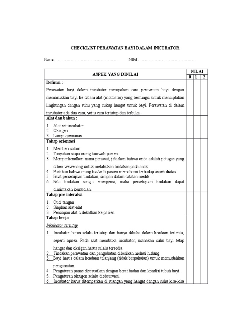 Checklist Perawatan Bayi Dalam Inkubator